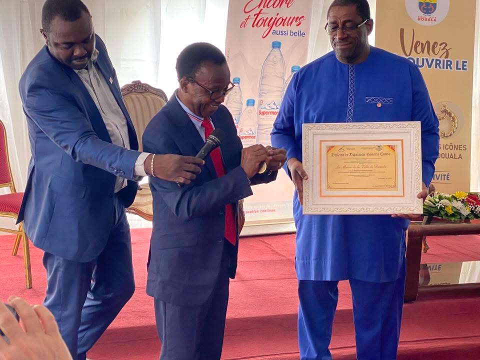« Vue les règlements des distinctions honorifiques, vue le procès-verbal du comité Adhoc chargé de distinctions honorifiques….. décerne à monsieur le maire de la ville de Douala le titre de Dignitaire Honoris causa pour sa contribution déterminante à la promotion de la littérature camerounaise …. . » Cette formule consacrée est dite par le président de L’Apec (Association des poètes du Cameroun, l’écrivain Pabe Mongo, par ailleurs parrain du Salon du livre de Douala(Salido).
