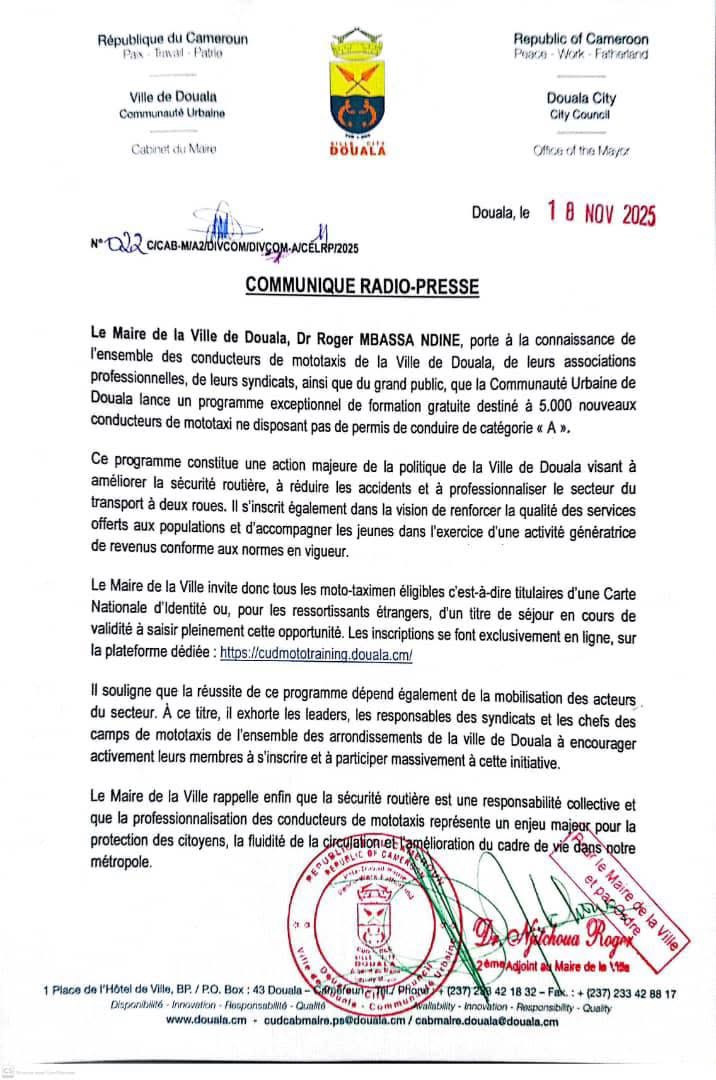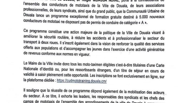 Le Dr Roger Mbassa Ndinè , maire de la ville a annoncé le 18 novembre dernier ,le lancement d’un vaste programme de formation gratuite destiné à 5000 conducteurs de mototaxi ne disposant pas encore du permis de conduire de catégorie À.