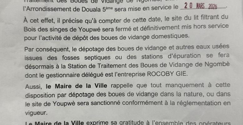 L’autorité municipale se veut ferme sur le respect de ces nouvelles dispositions. Le communiqué rappelle que tout manquement — qu’il s’agisse de dépotage dans la nature ou de tentatives d’utilisation de l’ancien site de Youpwé — sera sévèrement sanctionné conformément à la réglementation en vigueur.