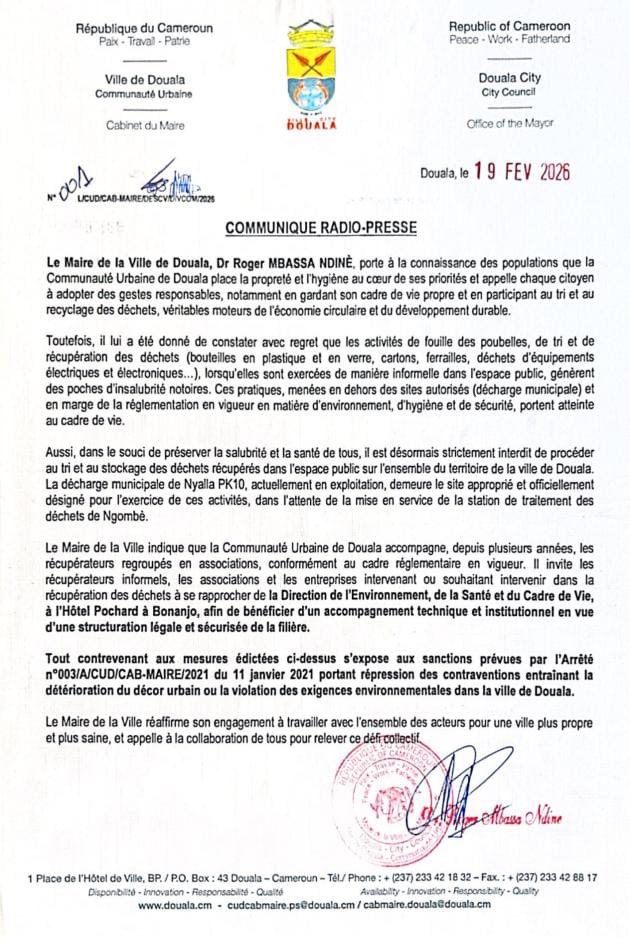 Dans un communiqué officiel publié le 19 février 2026, la Communauté Urbaine de Douala (CUD) durcit le ton contre le tri informel des déchets dans l’espace public. Alors que l’institution mise sur une professionnalisation de la filière, sur le terrain, certains acteurs comme Louison, chiffonnier à Fohato , semblent encore loin des nouvelles directives municipales.