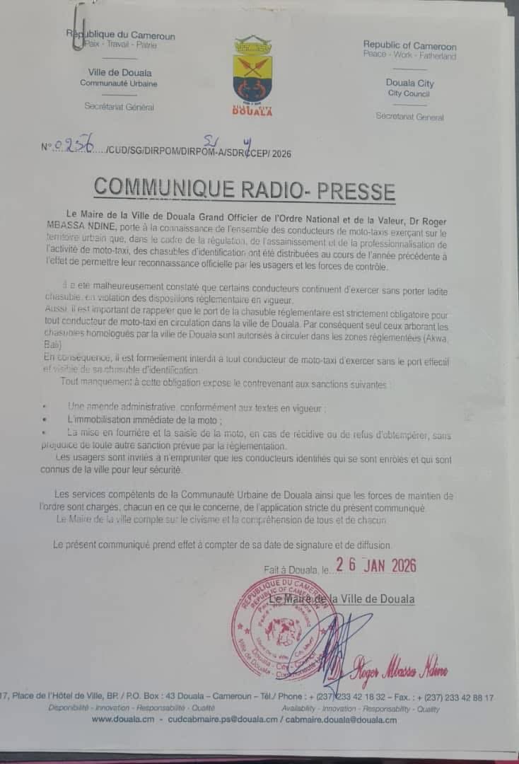 Par un communiqué radio-presse signé le 26 janvier 2026, le Maire de la Ville de Douala, Dr Roger Mbassa Ndine, a tenu à rappeler les règles strictes régissant l’activité de moto-taxi dans l’espace urbain. Malgré la distribution de chasubles d’identification l’année précédente pour faciliter la reconnaissance des conducteurs par les usagers et les forces de contrôle, de nombreux écarts ont été constatés.