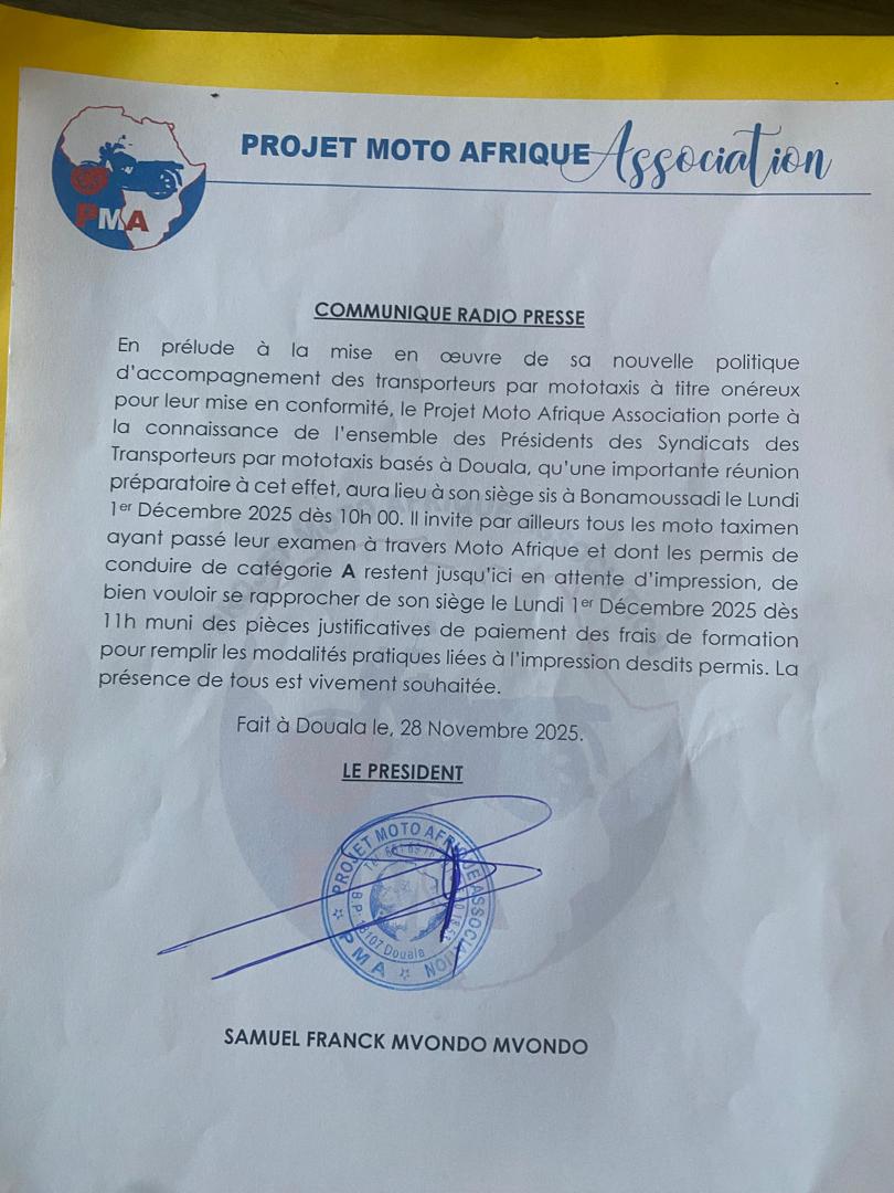 Cette annonce, révélée dans un communiqué radio-presse signé le 28 novembre par le président Mvondo Mvondo, marque une volonté claire : moderniser le secteur, renforcer la sécurité et offrir de meilleures conditions de travail aux moto-taximen.
