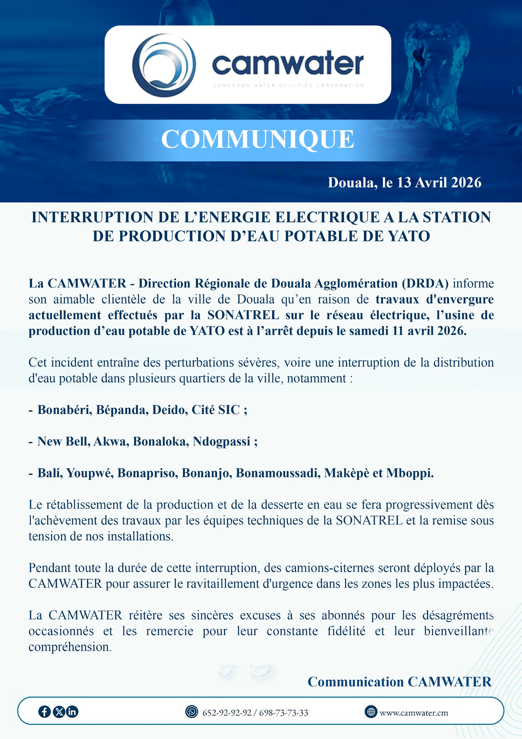 Le communiqué de la Cameroon Water Utilities Corporation (CAMWATER), bien que diffusé tardivement le 13 avril, a le mérite de lever le voile sur l’origine du mal. Ce n’est pas, cette fois, une panne technique interne à l’usine de Yato, mais une interruption de l’énergie électrique orchestrée par la Société Nationale de Transport d’Électricité (SONATREL).
