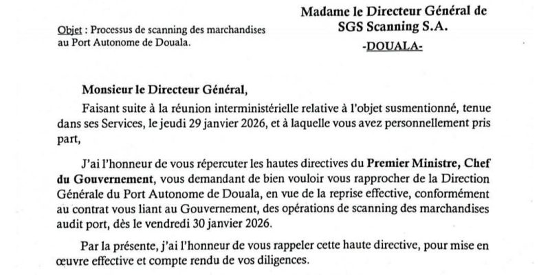 Le Premier Ministre a mis un terme au blocage du Port Autonome de Douala (PAD). Par une lettre officielle du 30 janvier 2026, son Secrétariat Général a ordonné à la multinationale SGS de reprendre immédiatement ses activités de scanning, invalidant ainsi la volonté de la direction du port de passer à l’opérateur Transatlantic D. S.A.