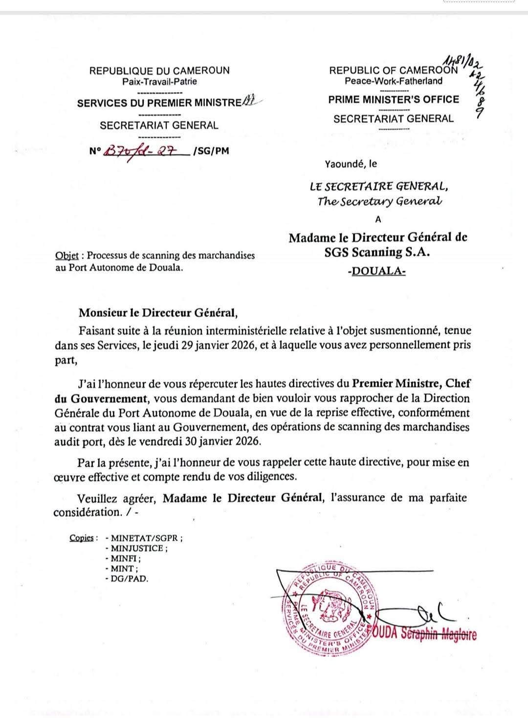 Le Premier Ministre a mis un terme au blocage du Port Autonome de Douala (PAD). Par une lettre officielle du 30 janvier 2026, son Secrétariat Général a ordonné à la multinationale SGS de reprendre immédiatement ses activités de scanning, invalidant ainsi la volonté de la direction du port de passer à l’opérateur Transatlantic D. S.A.