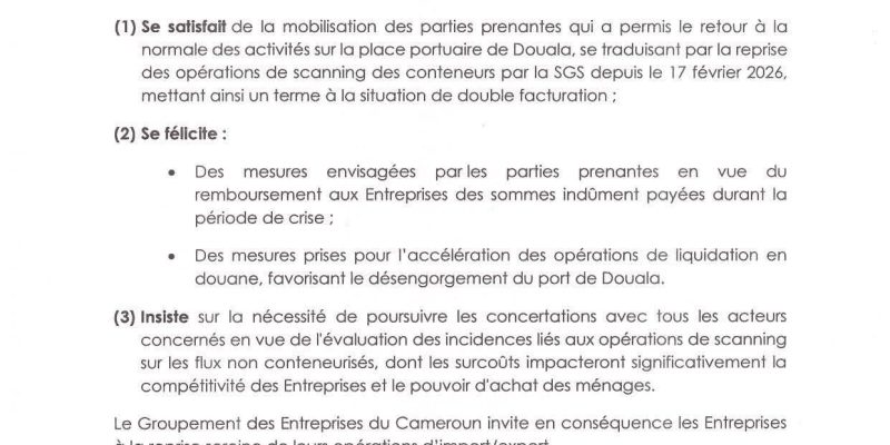 Le cœur du conflit, qui avait paralysé les opérations ces derniers jours, est officiellement levé. La SGS a repris le 17 février les opérations de scanning des conteneurs, mettant un terme au contentieux de la « double facturation » qui asphyxiait les opérateurs. Mais le véritable soulagement pour les entreprises vient de l’engagement pris sur le volet financier. Selon le patronat, des discussions sont désormais engagées pour le remboursement des sommes indûment perçues durant cette période de flou, une victoire significative pour le GECAM qui dénonçait ces surcoûts.