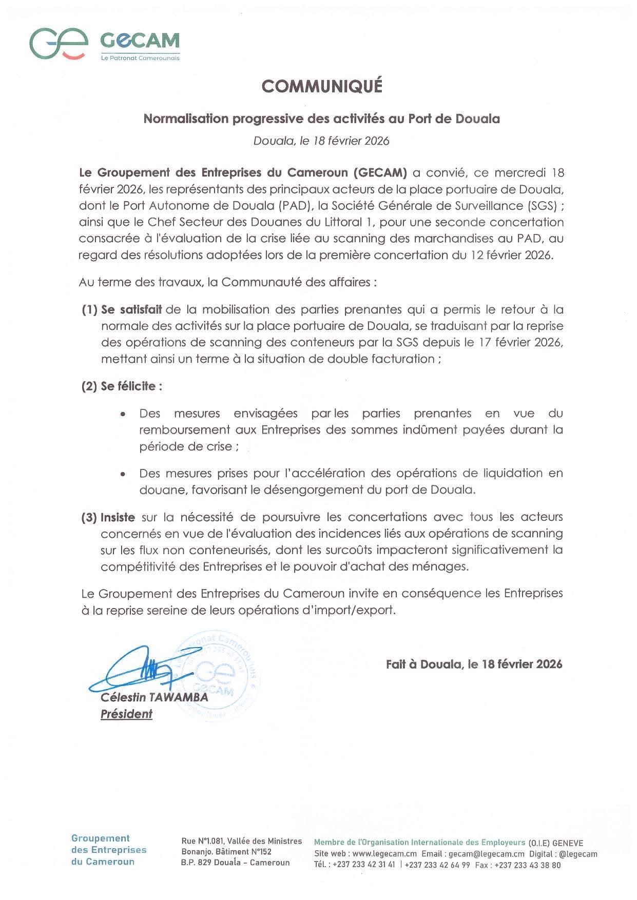 Fort de ces résolutions, le GECAM lance un appel solennel à l’ensemble des opérateurs économiques pour une reprise sereine de leurs activités, afin de redonner son souffle au premier port du pays.
