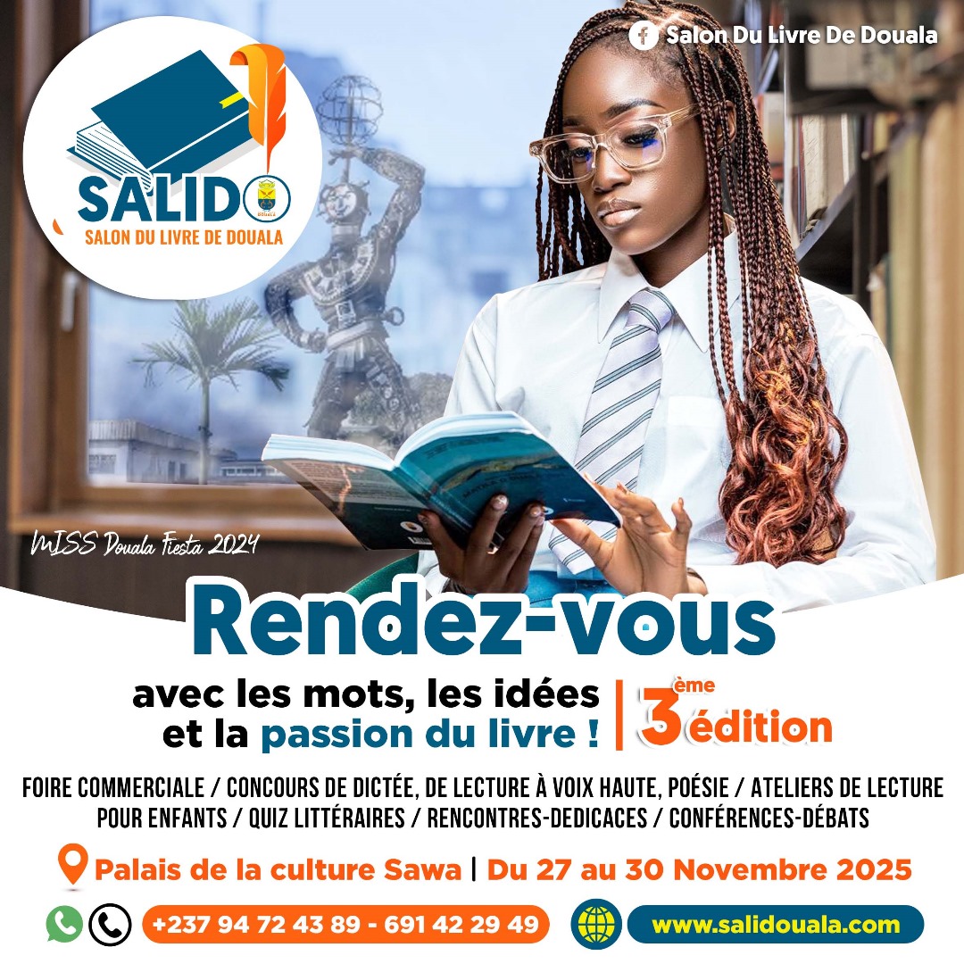 Il se tient du 27 au 30 novembre 2025 au Palais de la culture Sawa. Le Slon du livre de Douala(Salido) est un rendez-vous avec les idées et les mots. Plusieurs activités sont au programme de cette rencontre éminemment culturelle: concours de dictée, de lecture, de lecture à haute voix, poésie, atelier de lecture pour enfants, Quiz littérature, rencontres -dédicace, conférence débat et foire commerciale. L’objectif du Salido est de promouvoir le livre mais également la lecture en déclin dans les milieux jeunes.